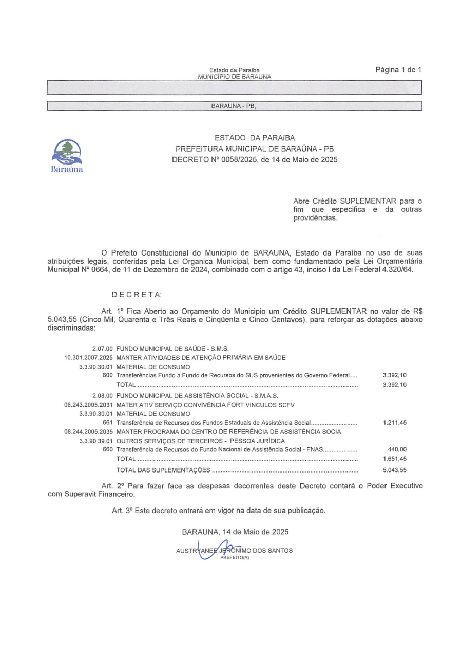 DECRETO Nº 058/2025 ABRE CREDITO SUPLEMENTAR PARA O FIM QUE ESPECIFICA E DA OUTRAS PROVIDENCIAS. - 17 DE JULHO DE 2025.