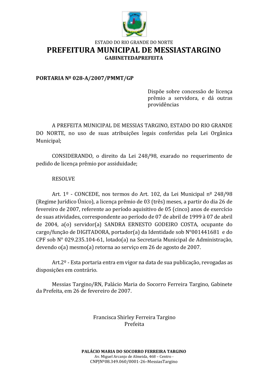 PORTARIA N°028-A - CONCESSÃO DE LICENÇA PRÊMIO A SERVIDORA SANDRA