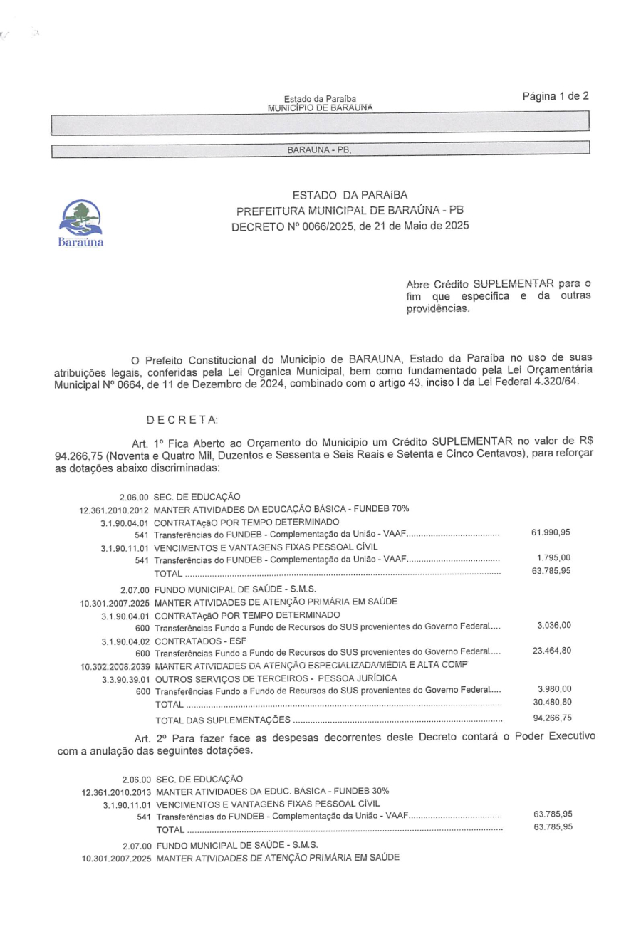 DECRETO Nº 066/2025 ABRE CREDITO SUPLEMENTAR PARA O FIM QUE ESPECIFICA E DA OUTRAS PROVIDÊNCIAS. - 21 DE JULHO DE 2025.