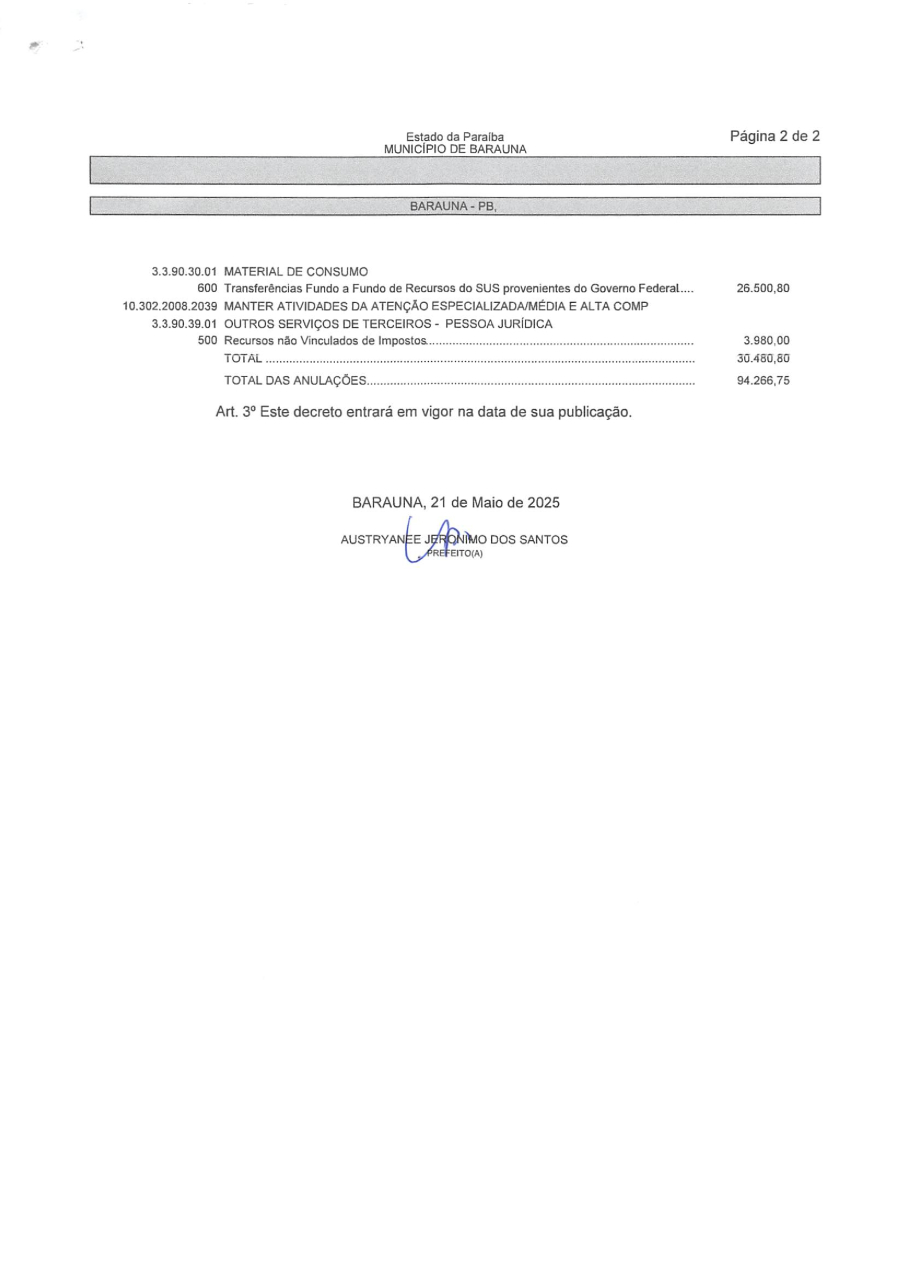 Conforme MP n° 2.200-2 de 24/08/2001, que institui a infraestrutura de chaves Públicas. Matéria Publicada no Diário Oficial do Município de Baraúna/PB no dia - Edição 01283.