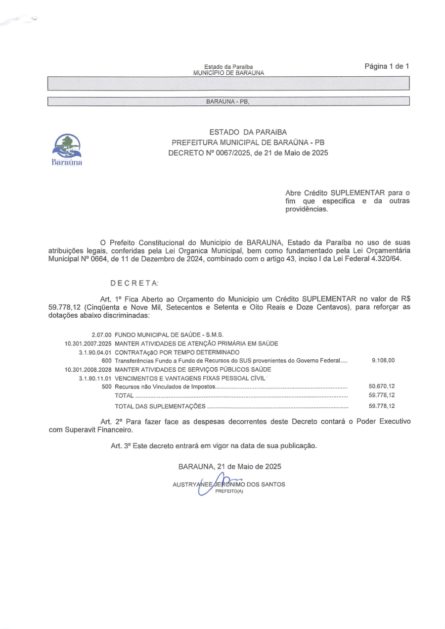 DECRETO Nº 067/2025 ABRE CREDITO SUPLEMENTAR PARA O FIM QUE ESPECIFICA E DA OUTRAS PROVIDÊNCIAS. - 21 DE JULHO DE 2025.