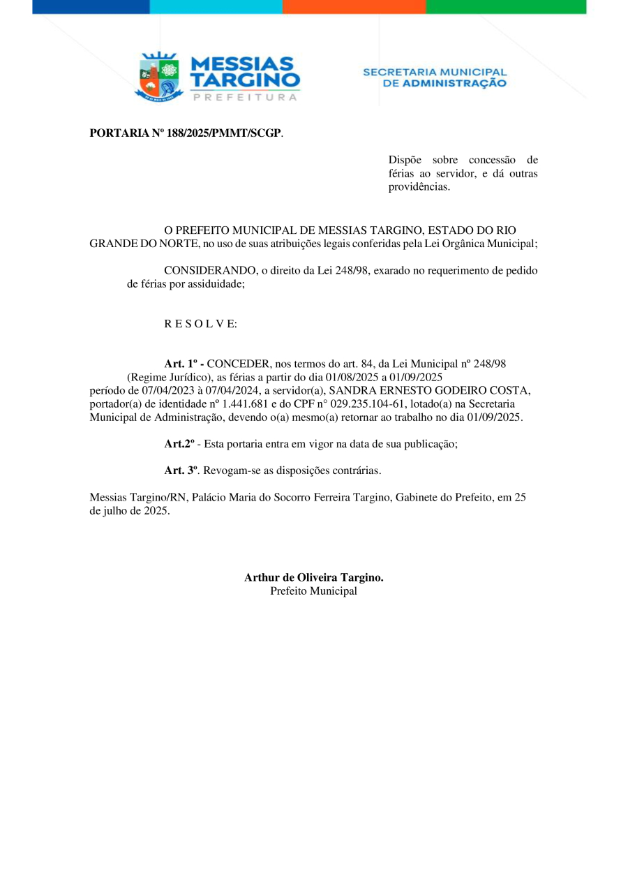 PORTARIA N°188 - CONCESSÃO DE FÉRIAS A SERVIDORA SANDRA