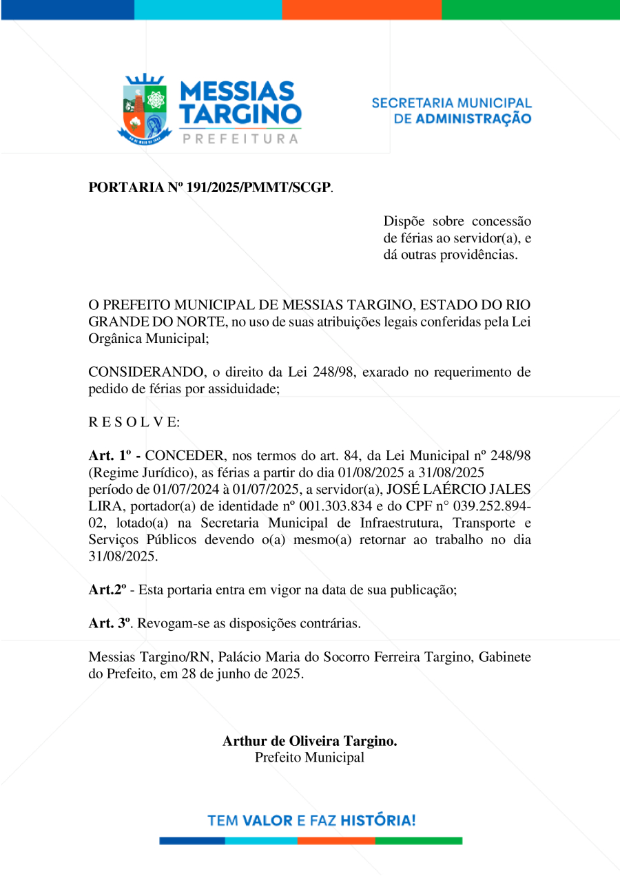 PORTARIA N°191 - FÉRIAS AO SERVIDOR JOSÉ
