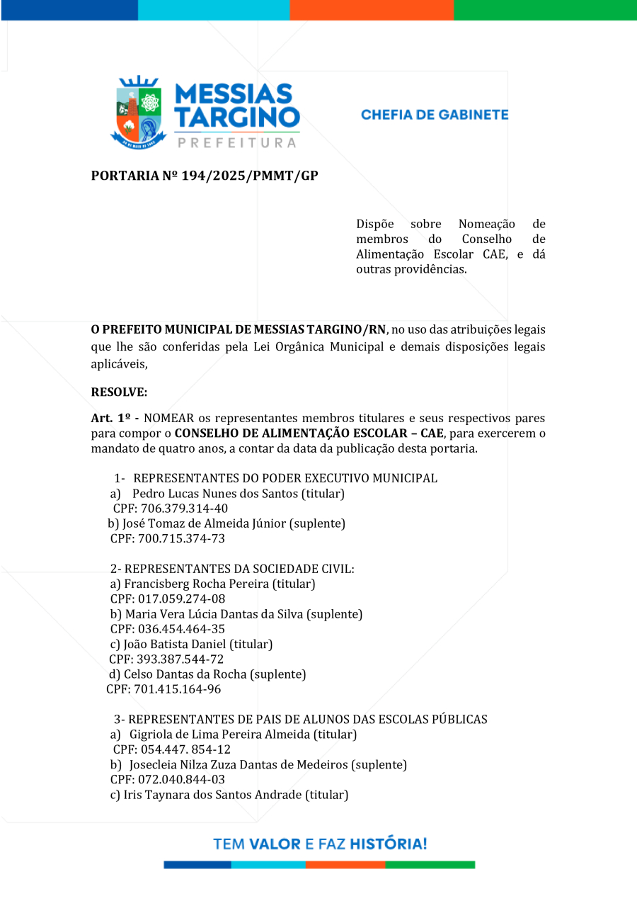 PORTARIA Nº 194/2025 - NOMEAÇÃO DE MEMBROS PARA O CONSELHO DE ALIMENTAÇÃO ESCOLAR – CAE