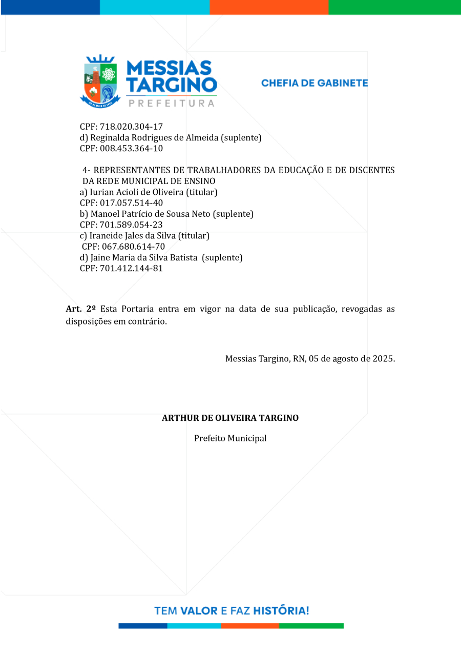 Conforme MP n° 2.200-2 de 24/08/2001, que institui a infraestrutura de chaves Públicas. Matéria Publicada no Diário Oficial do Município de Messias Targino/RN no dia - Edição 01346.