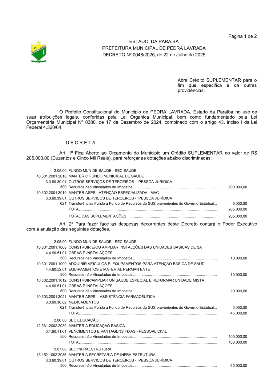DECRETO N° 0048/2025 - ABRE CRÉDITO SUPLEMENTAR PARA O FIM QUE ESPECIFICA