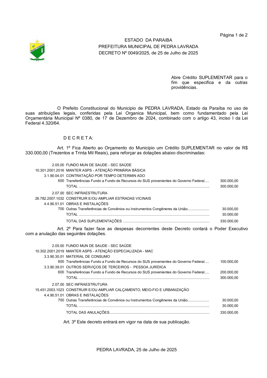 DECRETO N° 0049/2025 - ABRE CRÉDITO SUPLEMENTAR PARA O FIM QUE ESPECIFICA