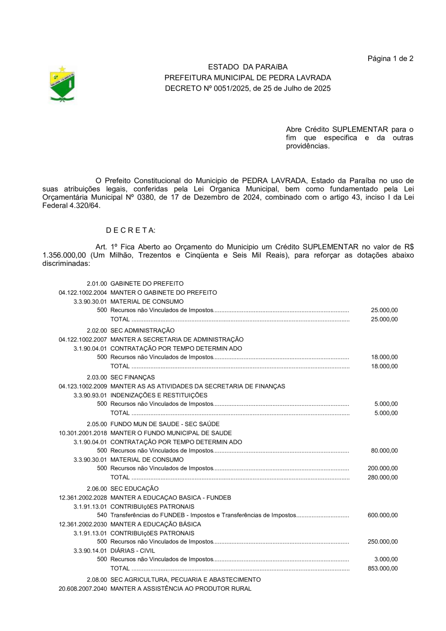 DECRETO N° 0051/2025 - ABRE CRÉDITO SUPLEMENTAR PARA O FIM QUE ESPECIFICA