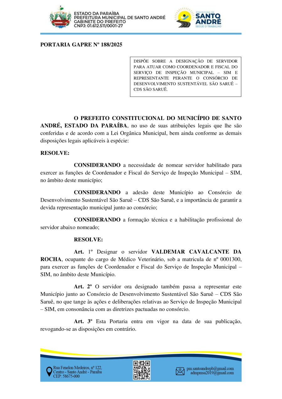 PORTARIA GAPRE Nº 188/2025 - DISPÕE SOBRE A DESIGNAÇÃO DE SERVIDOR PARA ATUAR COMO COORDENADOR E FISCAL DO SERVIÇO DE INSPEÇÃO MUNICIPAL – SIM E REPRESENTANTE PERANTE O CONSÓRCIO DE DESENVOLVIMENTO SUSTENTÁVEL SÃO SARUÊ – CDS SÃO SARUÊ.