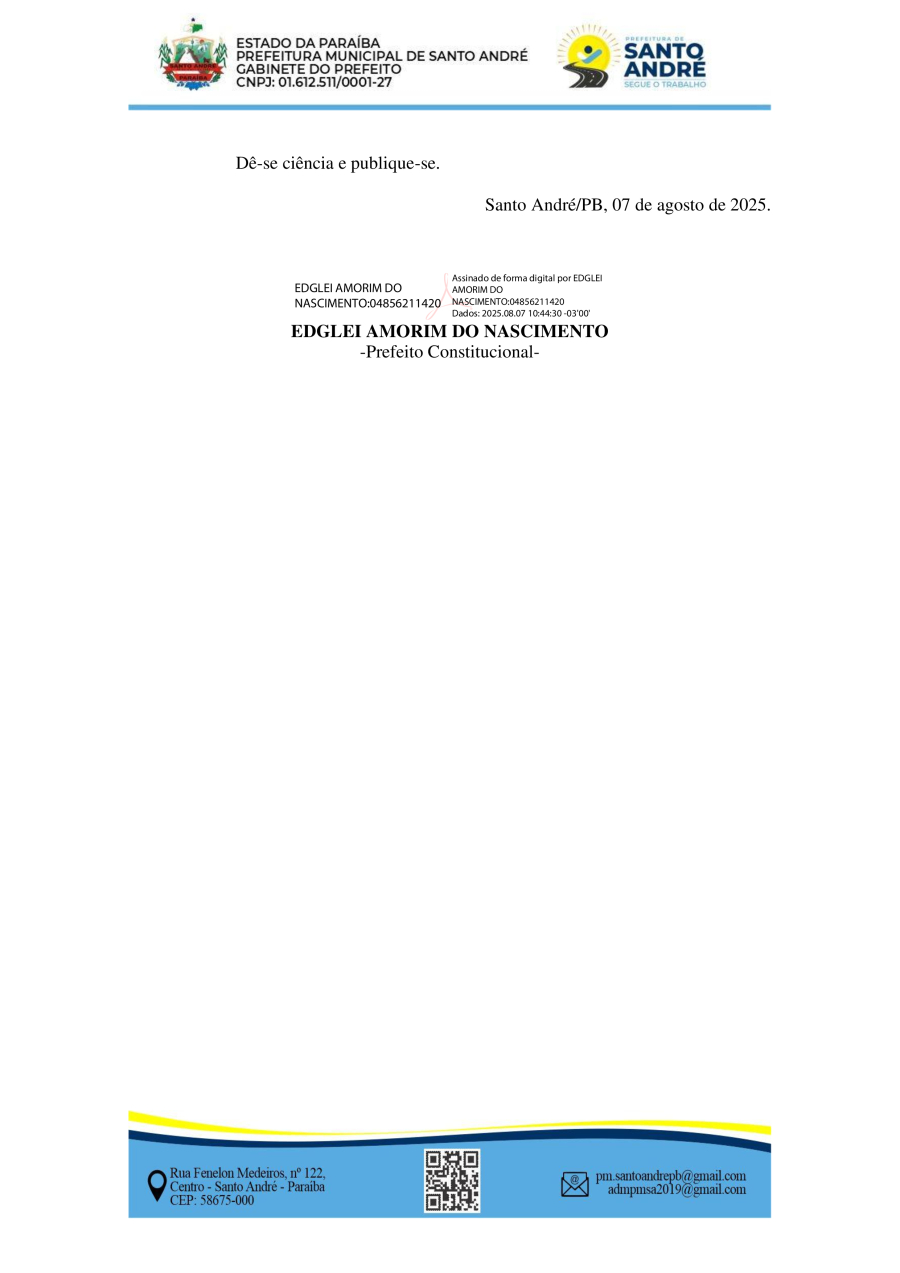 Conforme MP n° 2.200-2 de 24/08/2001, que institui a infraestrutura de chaves Públicas. Matéria Publicada no Diário Oficial do Município de Santo André/PB no dia - Edição 01272.