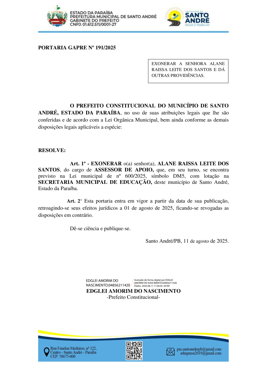 PORTARIA N° 0191/2025 - EXONERAR A SENHORA ALANE RAISSA LEITE DOS SANTOS