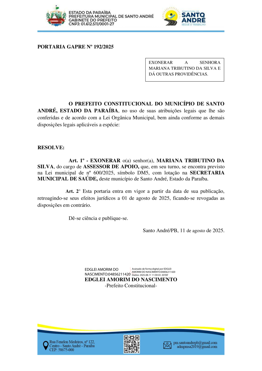 PORTARIA N° 0192/2025 - EXONERAR A SENHORA MARIANA TRIBUTINO DA SILVA