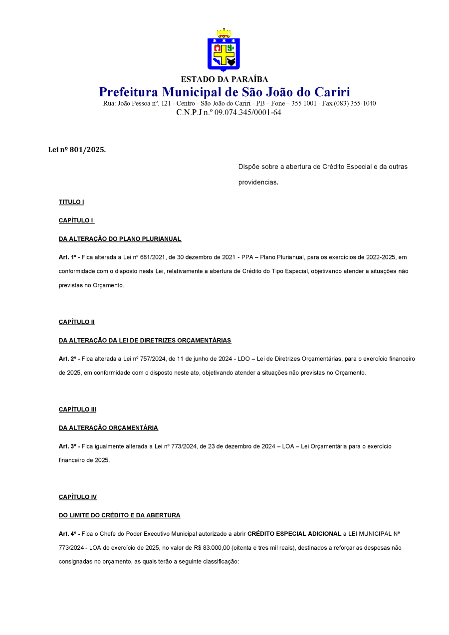 LEI 801/2025 - DISPÕE SOBRE ABERTURA DE CRÉDITO ESPECIAL E DA OUTRAS PROVIDÊNCIAS