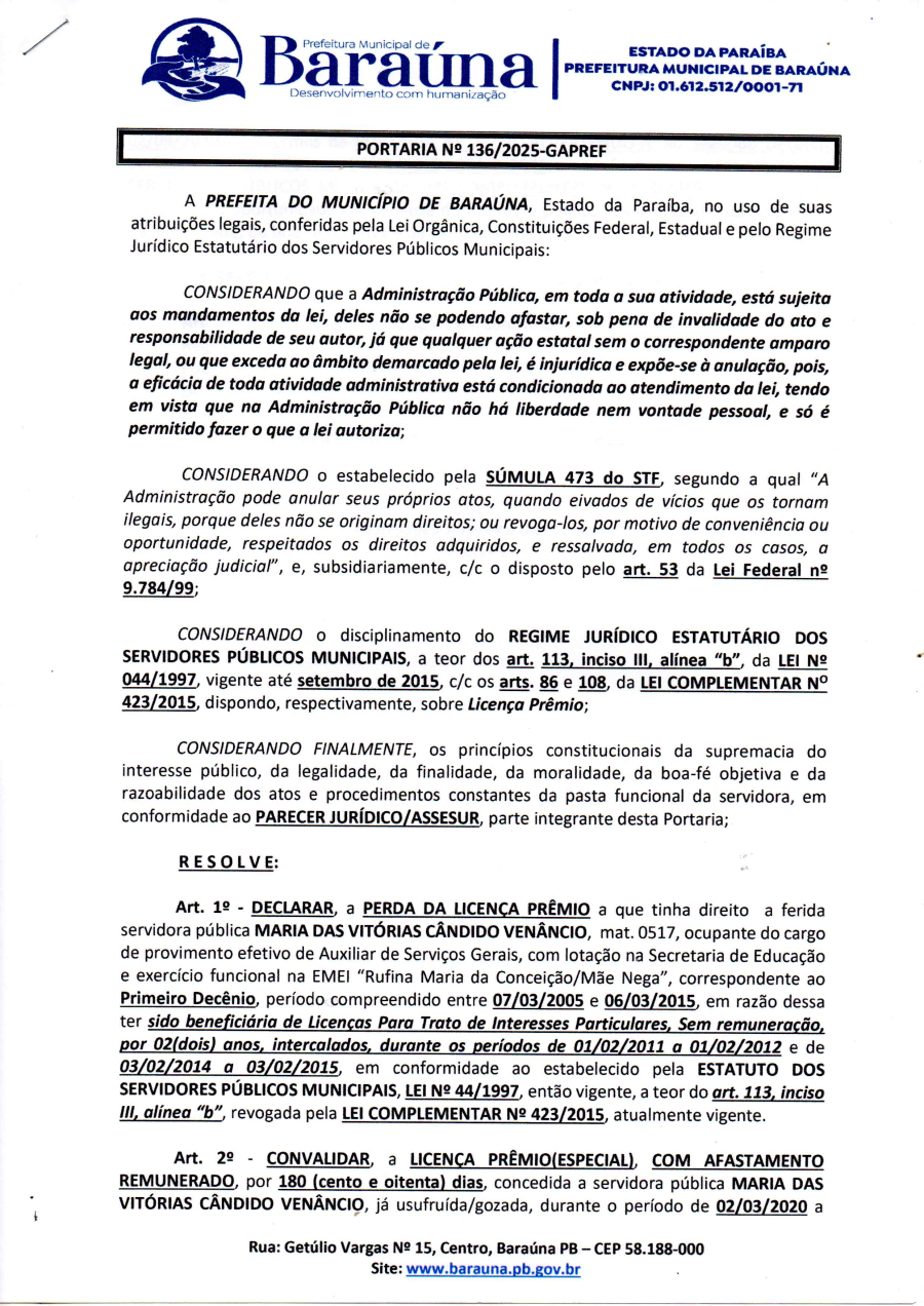 PORTARIA Nº 136/2025-GAPREF - DECLARAR A PERDA DA LICENÇA PRÊMIO, A QUE TINHA DIREITO A REFERIDA SERVIDORA MARIA DAS VITÓRIAS CANDIDO VENANCIO.- 12 DE AGOSTO DE 2025.
