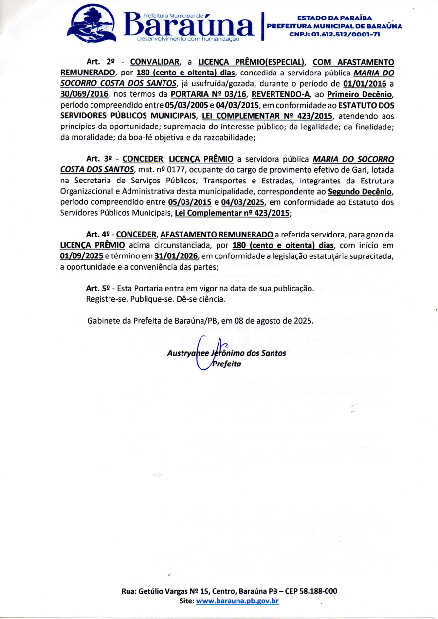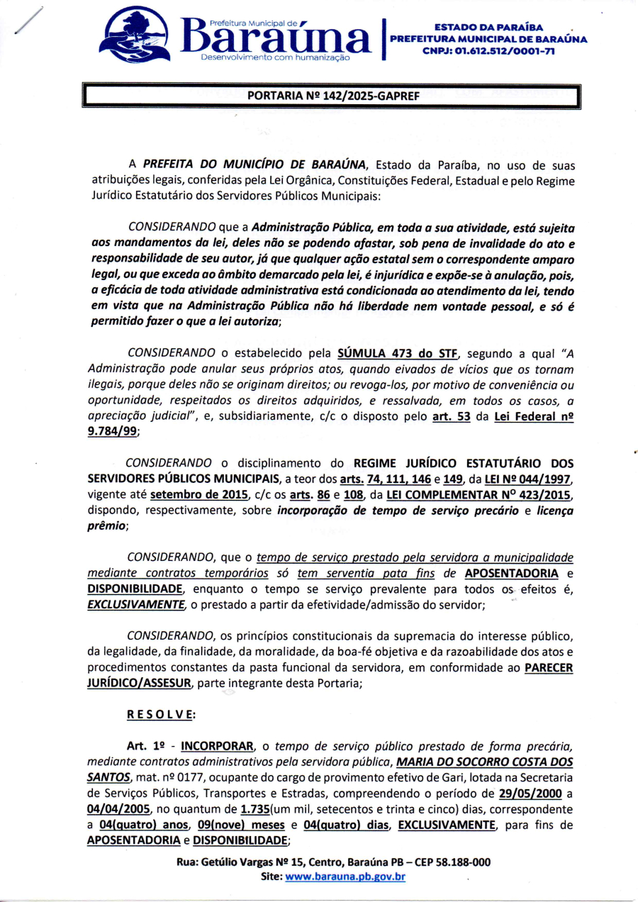 PORTARIA Nº 142/2025-GAPREF - INCORPORAR, CONVALIDAR E CONCEDER LICENÇA PREMIO A SERVIDORA PÚBLICA MARIA DO SOCORRO COSTA DOS SANTOS. - 12 DE AGOSTO DE 2025.