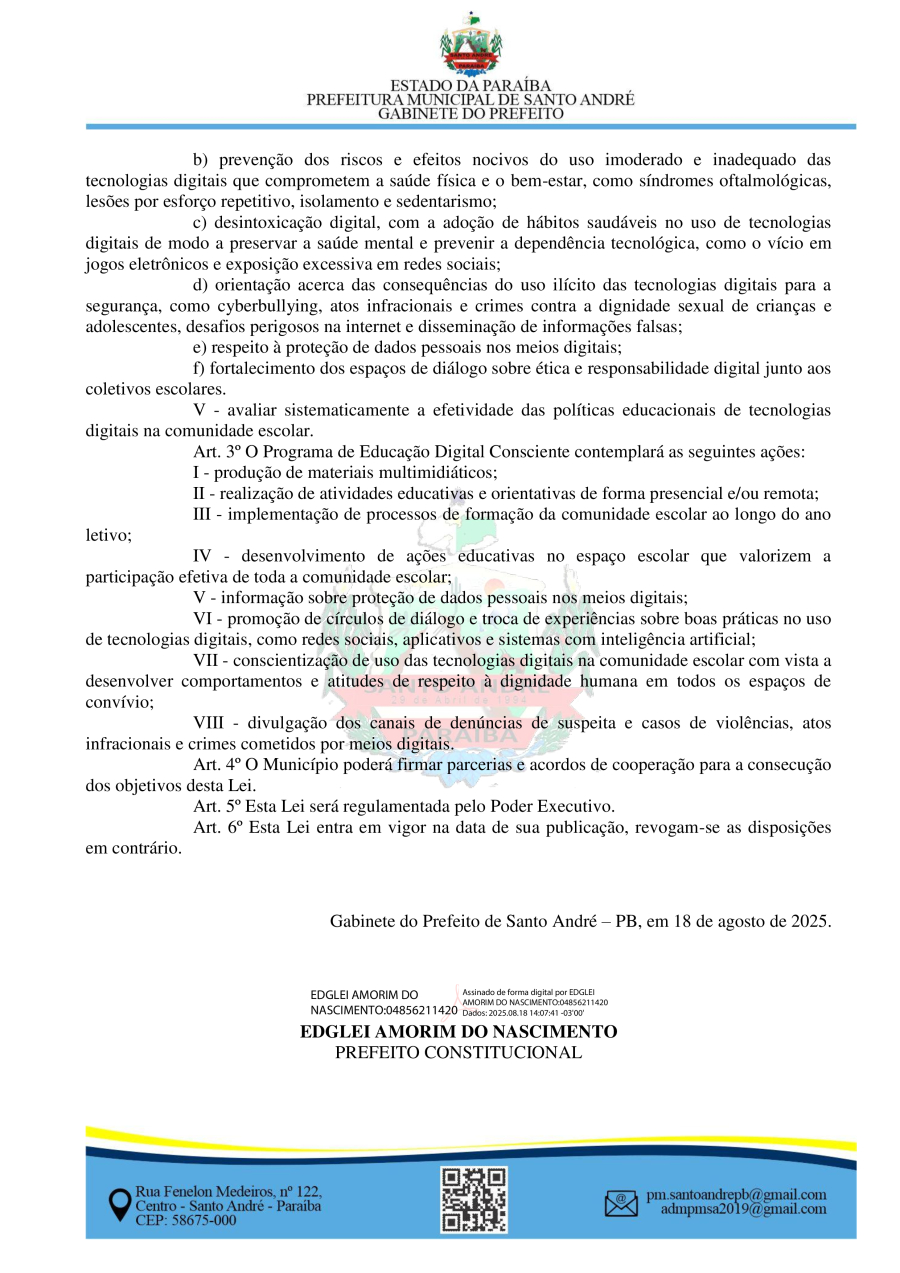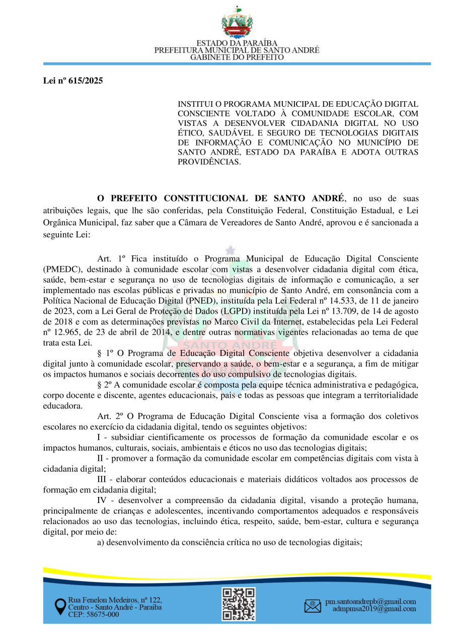 LEI Nº 615/2025 - INSTITUI O PROGRAMA MUNICIPAL DE EDUCAÇÃO DIGITAL CONSCIENTE VOLTADO À COMUNIDADE ESCOLAR, COM VISTAS A DESENVOLVER CIDADANIA DIGITAL NO USO ÉTICO, SAUDÁVEL E SEGURO DE TECNOLOGIAS DIGITAIS DE INFORMAÇÃO E COMUNICAÇÃO NO MUNICÍPIO DE SANTO ANDRÉ, ESTADO DA PARAÍBA E ADOTA OUTRAS PROVIDÊNCIAS.
