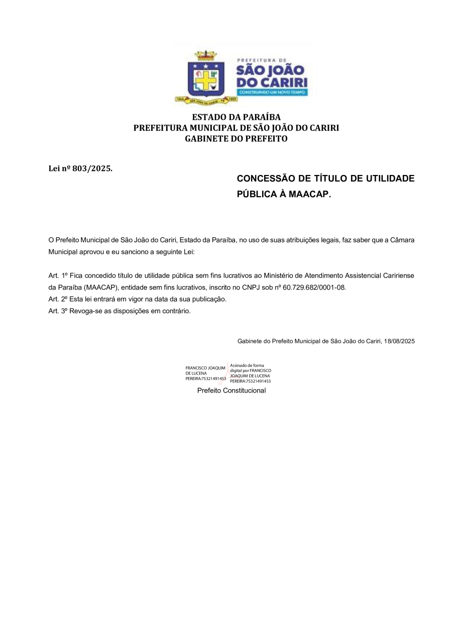 LEI 803/2025 - CONCESSÃO DE TÍTULO DE UTILIDADE PÚBLICA À MAACAP.