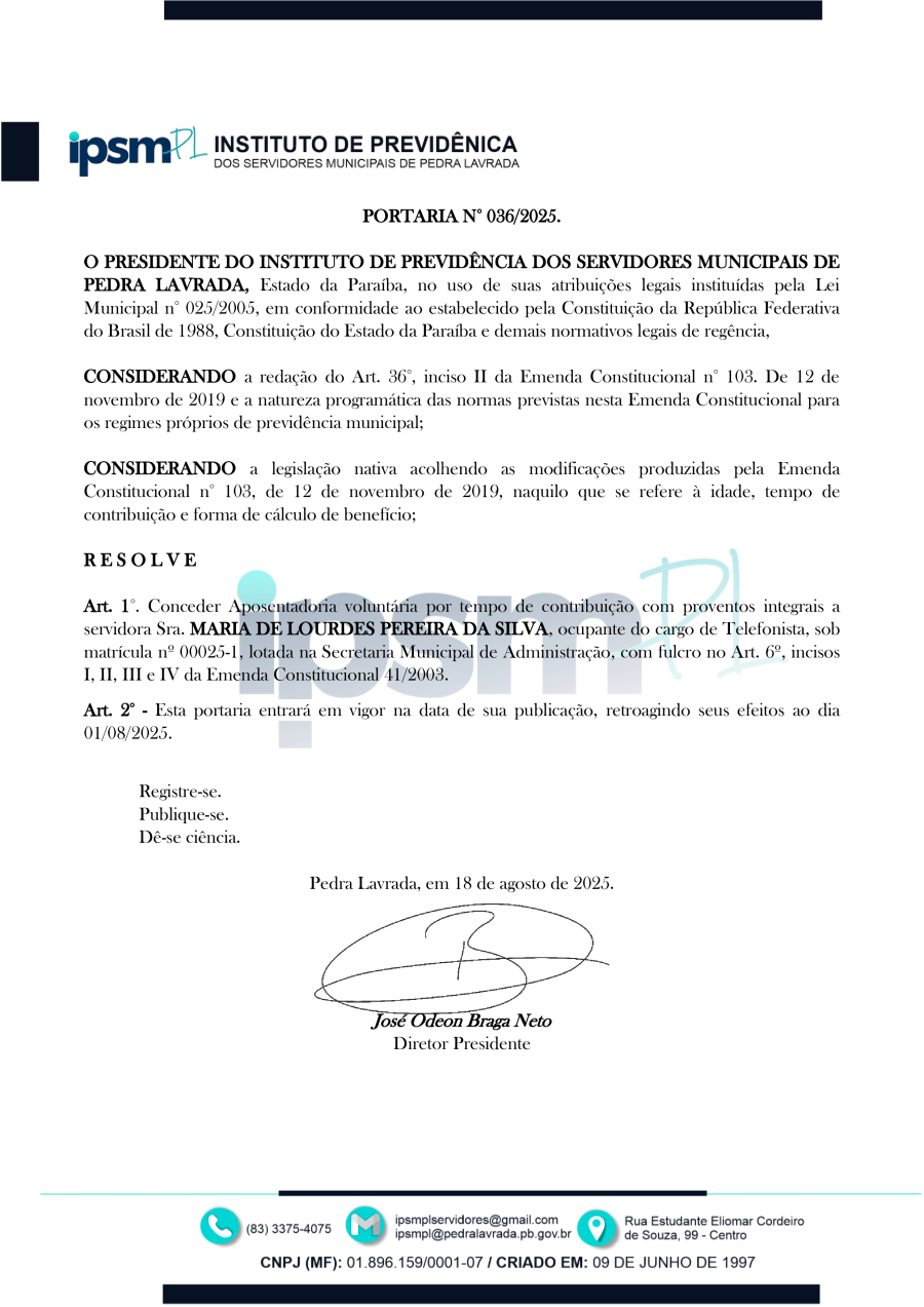 PORTARIA N° 0036/2025 - CONCEDER APOSENTADORIA VOLUNTÁRIA POR TEMPO DE CONTRIBUIÇÃO À SRAª MARIA DE LOURDES PEREIRA DA SILVA