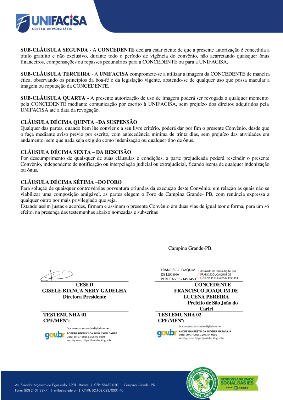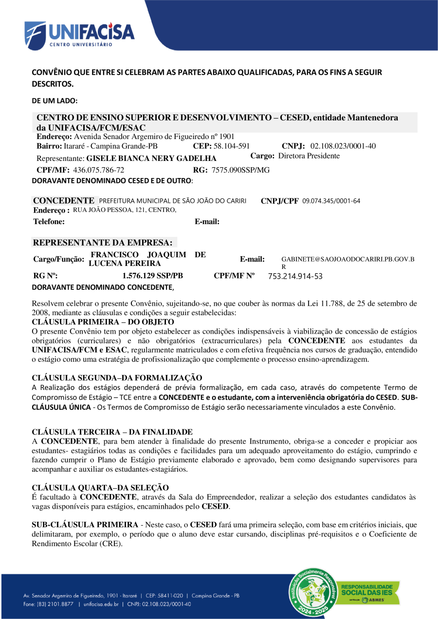 CONVÊNIO PREFEITURA MUNICIPAL DE SÃO JOÃO DO CARIRI E CENTRO DE ENSINO SUPERIOR E DESENVOLVIMENTO - SESD DA UNIFACISA/FCM/ESAC