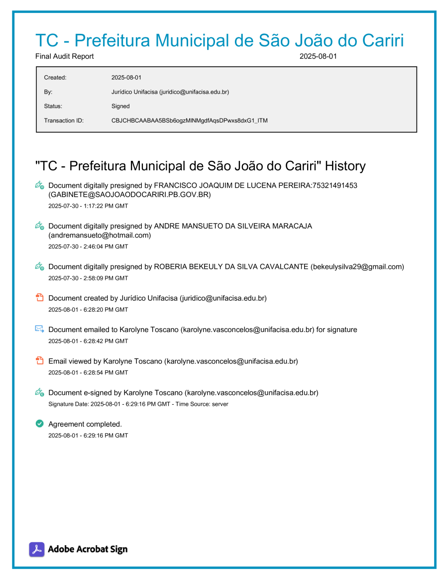 Conforme MP n° 2.200-2 de 24/08/2001, que institui a infraestrutura de chaves Públicas. Matéria Publicada no Diário Oficial do Município de São João do Cariri/PB no dia - Edição 01798.