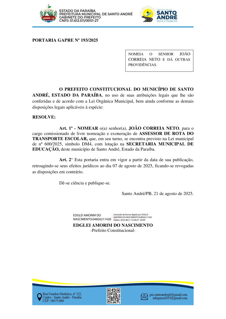 PORTARIA GAPRE Nº 193/2025 - NOMEIA O SENHOR JOÃO CORREIA NETO E DÁ OUTRAS PROVIDÊNCIAS.