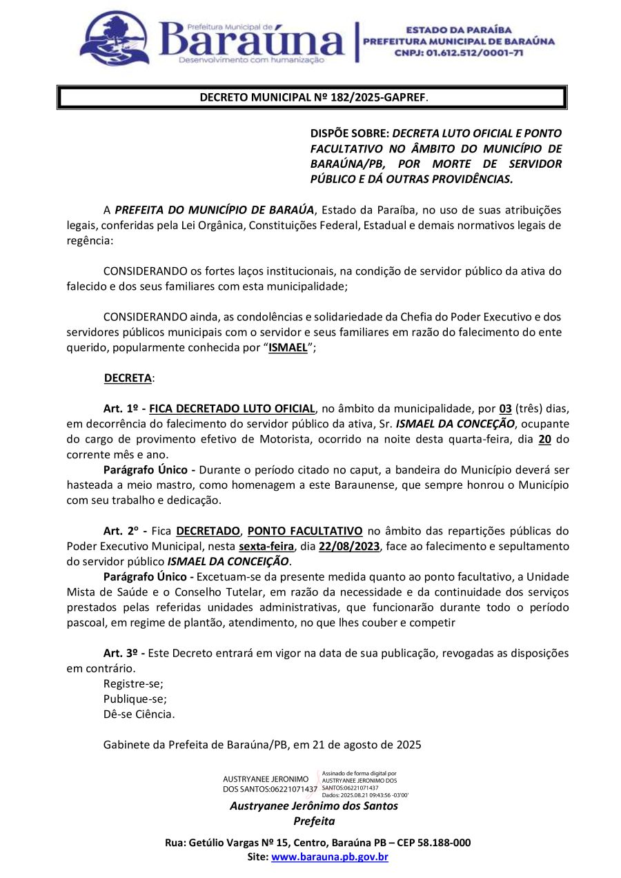 DECRETO MUNICIPAL Nº 182/2025-GAPREF - DISPÕE SOBRE: DECRETA LUTO OFICIAL E PONTO FACULTATIVO NO ÂMBITO DO MUNICIPIO DE BARAÚNA-PB, POR MORTE DE SERVIDOR PÚBLICO E DA OUTRAS PROVIDÊNCIAS. - 21 DE AGOSTO DE 2025.