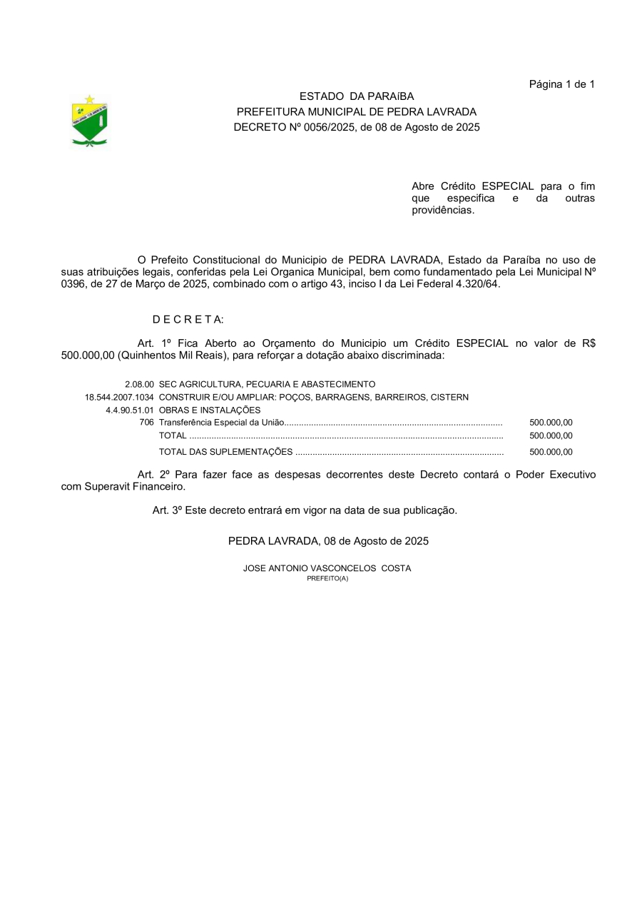 DECRETO N° 0056/2025 - ABRE CRÉDITO ESPECIAL PARA O FIM QUE ESPECIFICA