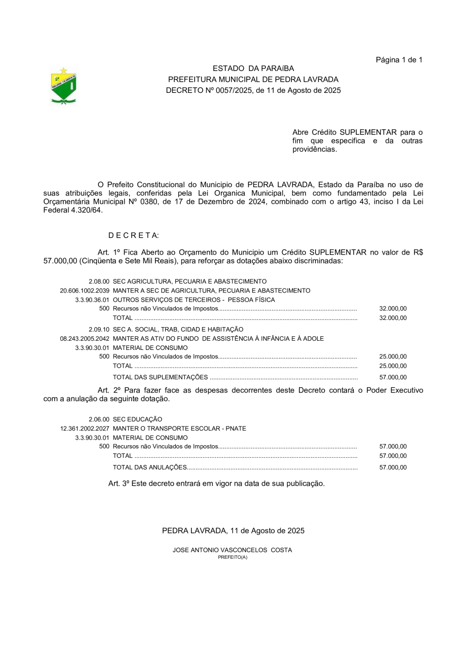 DECRETO N° 0057/2025 - ABRE CRÉDITO SUPLEMENTAR PARA O FIM QUE ESPECIFICA