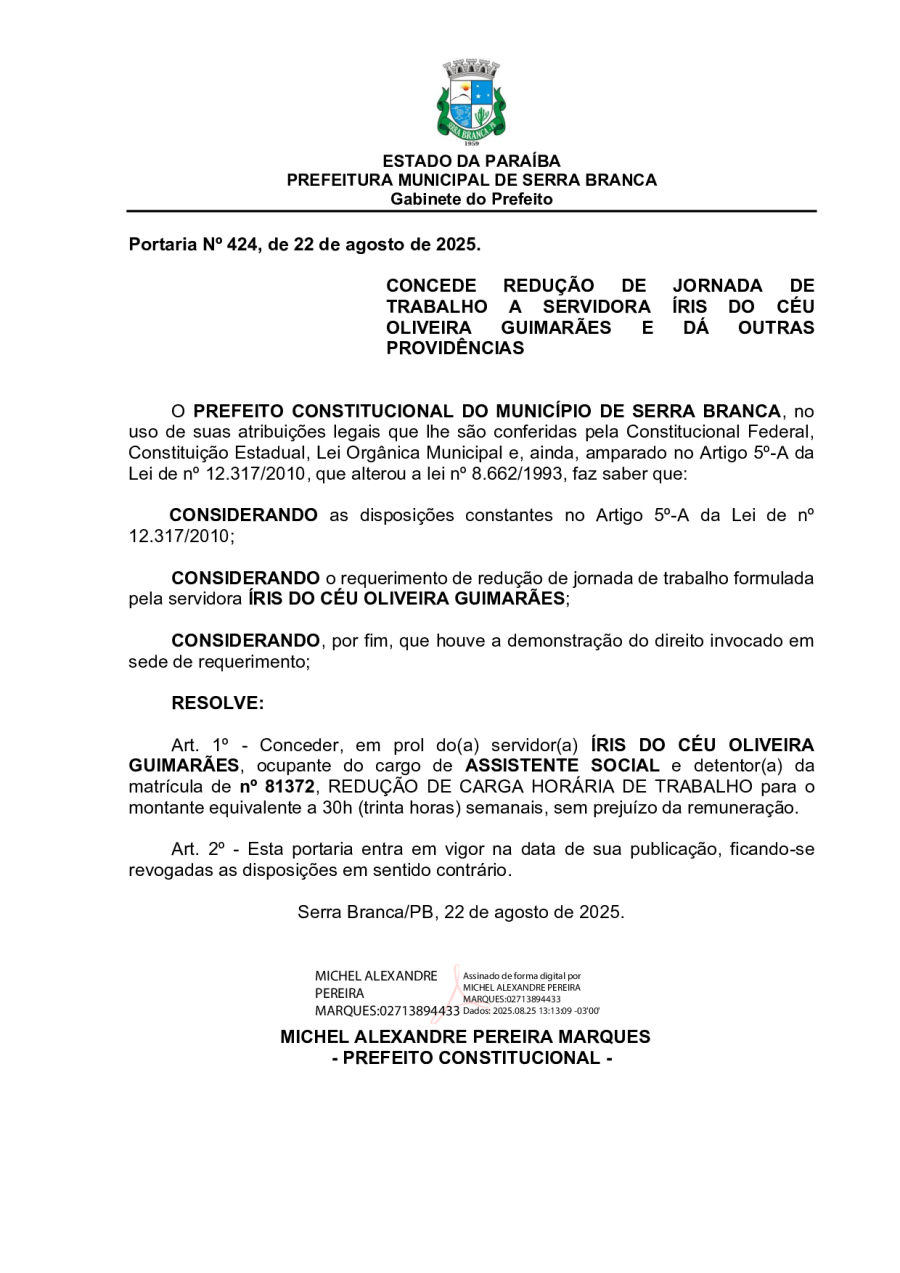 PORTARIA N° 0424/2025 - CONCEDE REDUÇÃO DE JORNADA DE TRABALHO A SERVIDORA ÍRIS DO CÉU OLIVEIRA GUIMARÃES