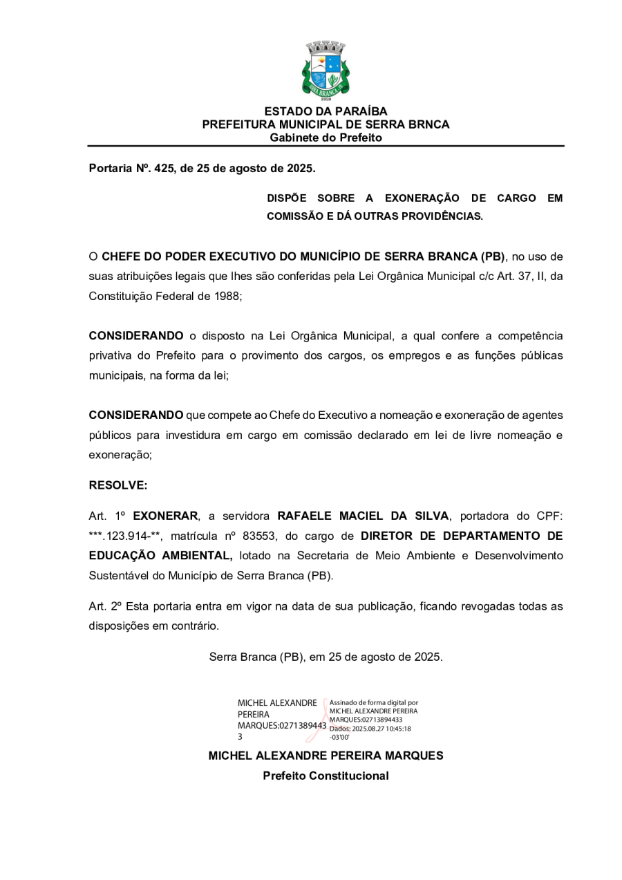 PORTARIA N° 0425/2025 - EXONERAÇÃO DE RAFAELE MACIEL DA SILVA