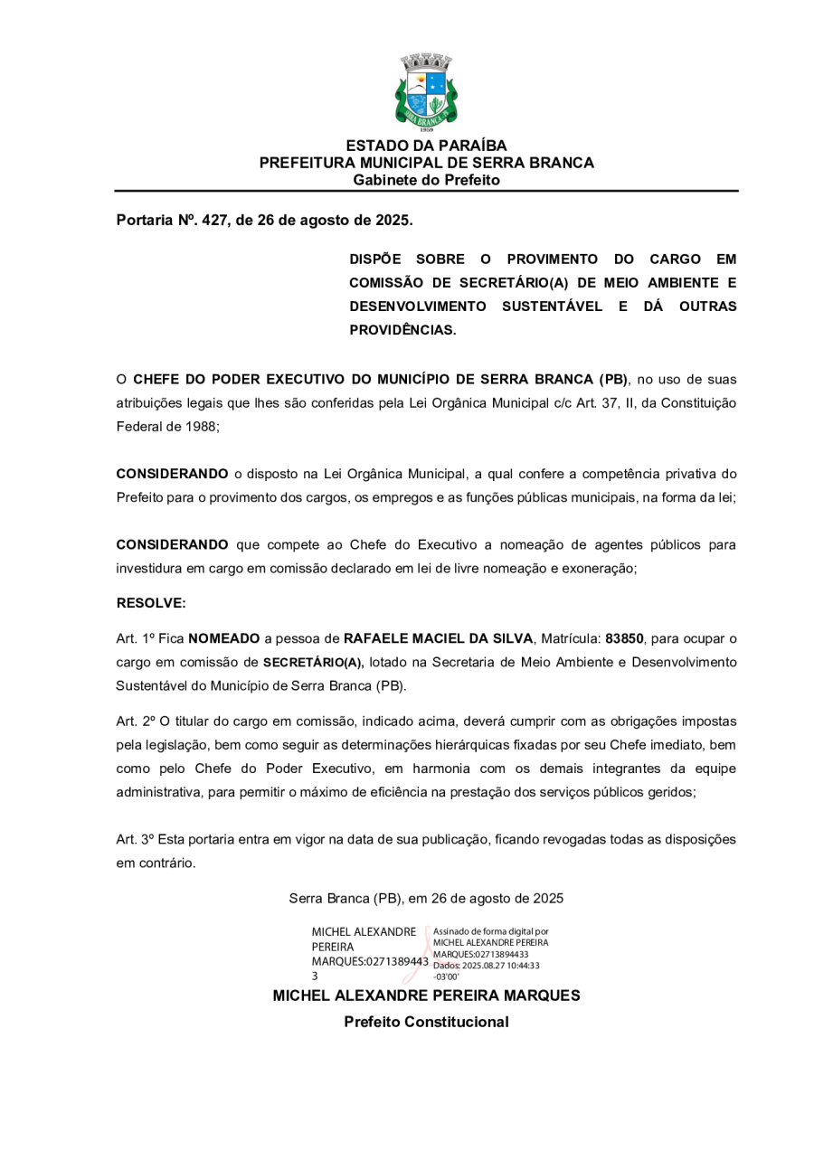 PORTARIA N° 0427/2025 - NOMEAÇÃO DE RAFAELE MACIEL DA SILVA