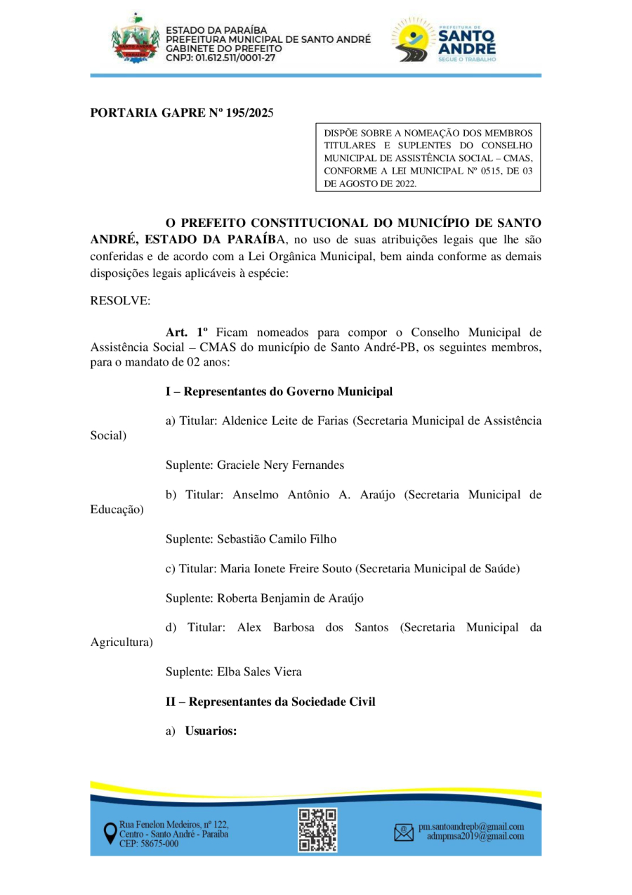 PORTARIA GAPRE Nº 195/2025 - DISPÕE SOBRE A NOMEAÇÃO DOS MEMBROS TITULARES E SUPLENTES DO CONSELHO MUNICIPAL DE ASSISTÊNCIA SOCIAL – CMAS, CONFORME A LEI MUNICIPAL Nº 0515, DE _ DE AGOSTO DE 2022.
