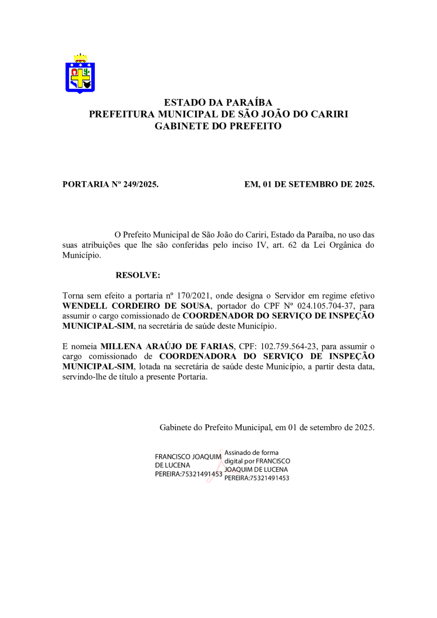 PORTARIA 249/2025 - TORNA SEM EFEITO PORTARIA 170/2021 - NOMEAÇÃO MILLENA ARAÚJO DE FARIAS