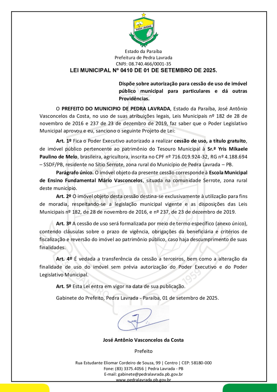 LEI N° 0410/2025 - DISPÕE SOBRE AUTORIZAÇÃO PARA CESSÃO DE USO DE IMÓVEL PÚBLICO MUNICIPAL PARA PARTICULARES