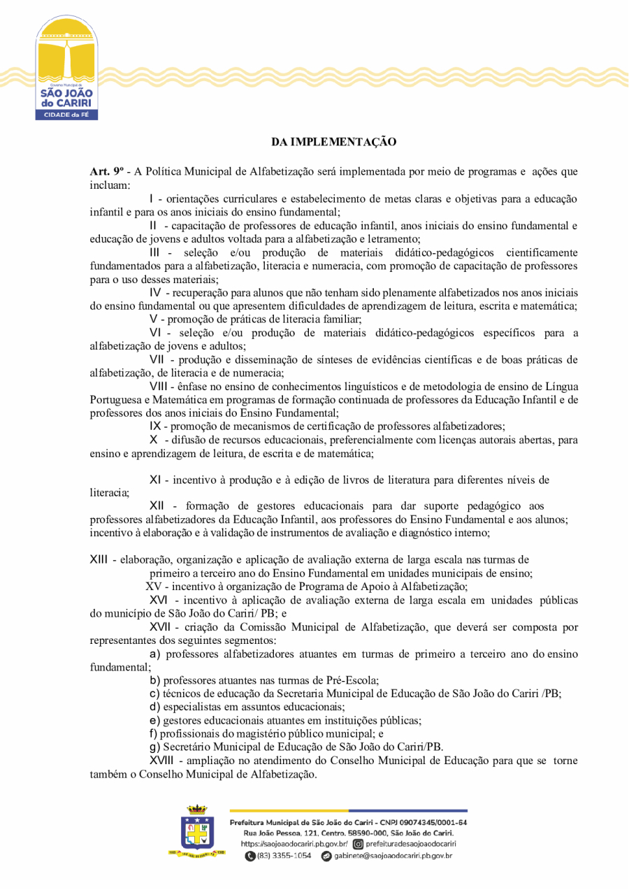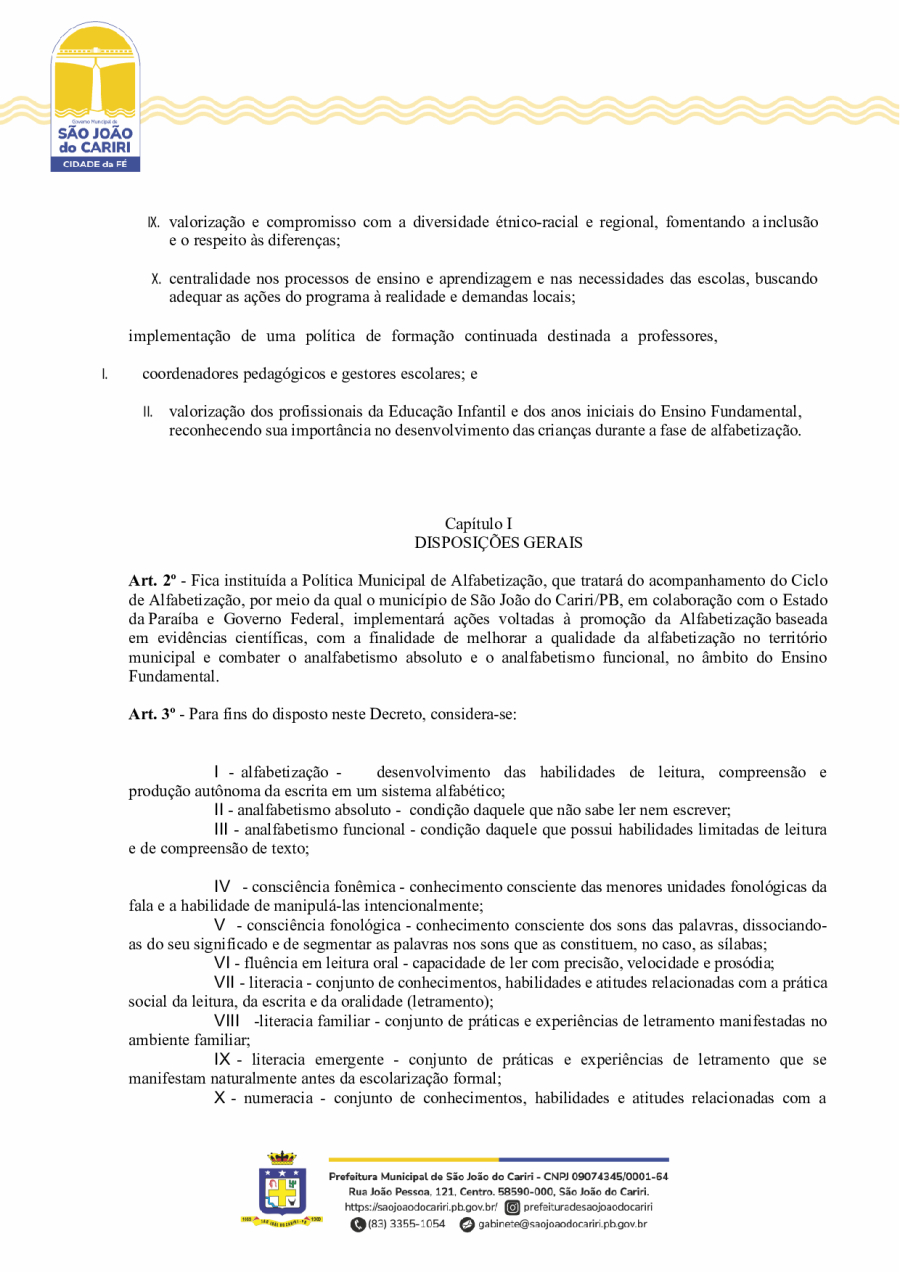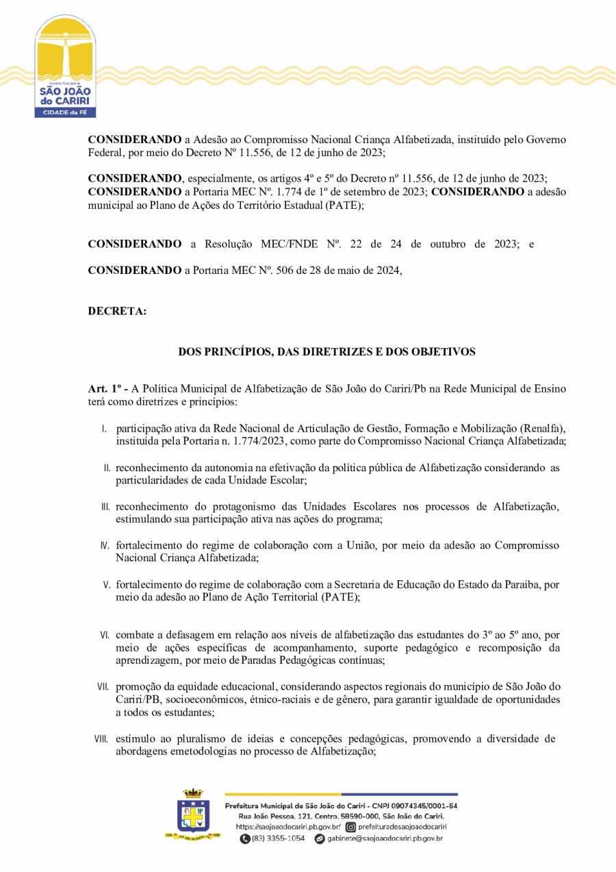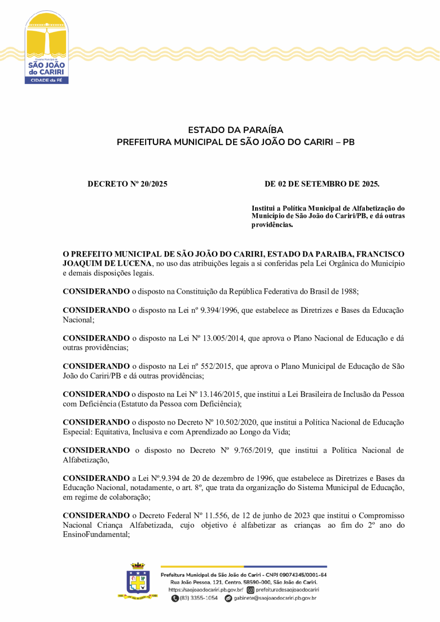 DECRETO Nº20/ - INSTITUI A POLÍTICA MUNICIPAL DE ALFABETIZAÇÃO DO MUNICÍPIO DE SÃO JOÃO DO CARIRI/PB, E DÁ OUTRAS PROVIDÊNCIAS.