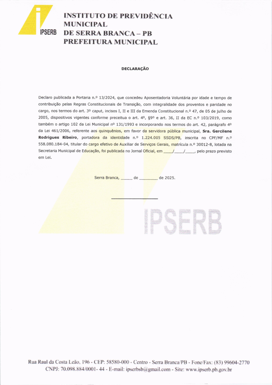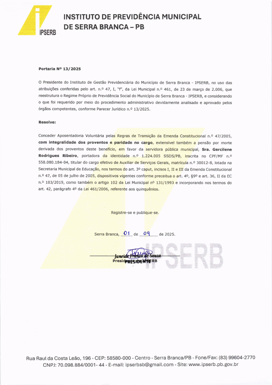 PORTARIA N° 0013/2025 - CONCEDER APOSENTADORIA VOLUNTÁRIA A SERVIDORA PÚBLICA MUNICIPAL SRª GERCILENE RODRIGUES RIBEIRO