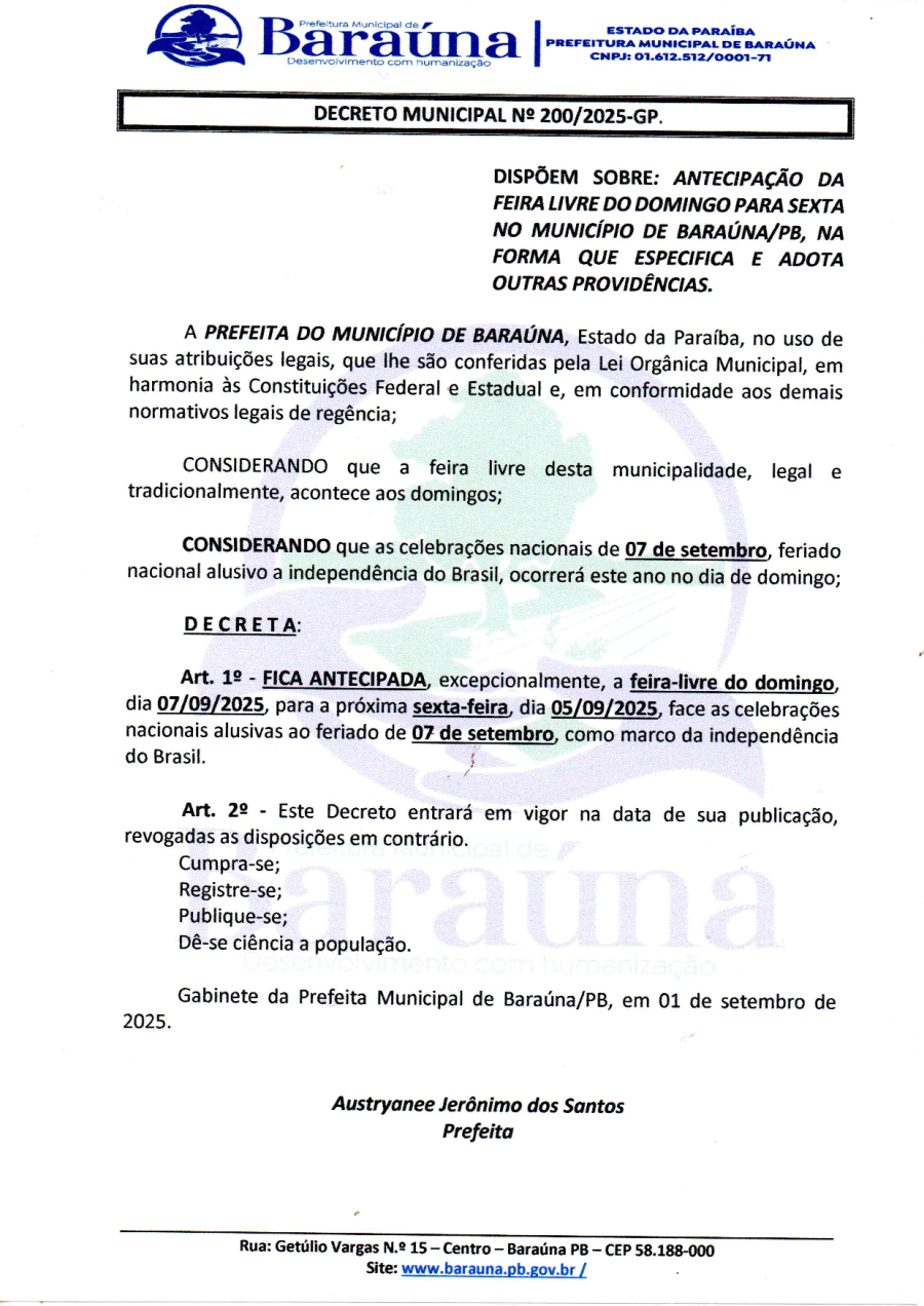 DECRETO MUNICIPAL Nº 200/2025-GP - DISPÕEM SOBRE: ANTECIPAÇÃO DA FEIRA LIVRE DO DOMINGO PARA SEXTA NO MUNICIPIO DE BARAÚNA/PB, NA FORMA QUE ESPECIFICA E ADOTA OUTRAS PROVIDÊNCIAS. - 02 DE SETEMBRO DE 2025.