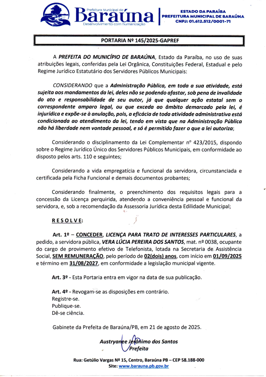 PORTARIA Nº 145/2025-GAPREF - CONCEDER LICENÇA PARA TRATO DE INTERESSES PARTICULARES A PEDIDO, A SERVIDORA VERA LÚCIA PEREIRA DOS SANTOS. - 02 DE SETEMBRO DE 2025.