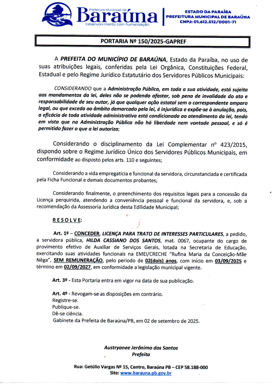 PORTARIA Nº 150/2025-GAPREF - CONCEDER LICENÇA PARA TRATO DE INTERESSE PARTICULARES, A PEDIDO, A SERVIDORA PÚBLICA, HILDA CASSIANO DOS SANTOS. - 03 DE SETEMBRO DE 2025.