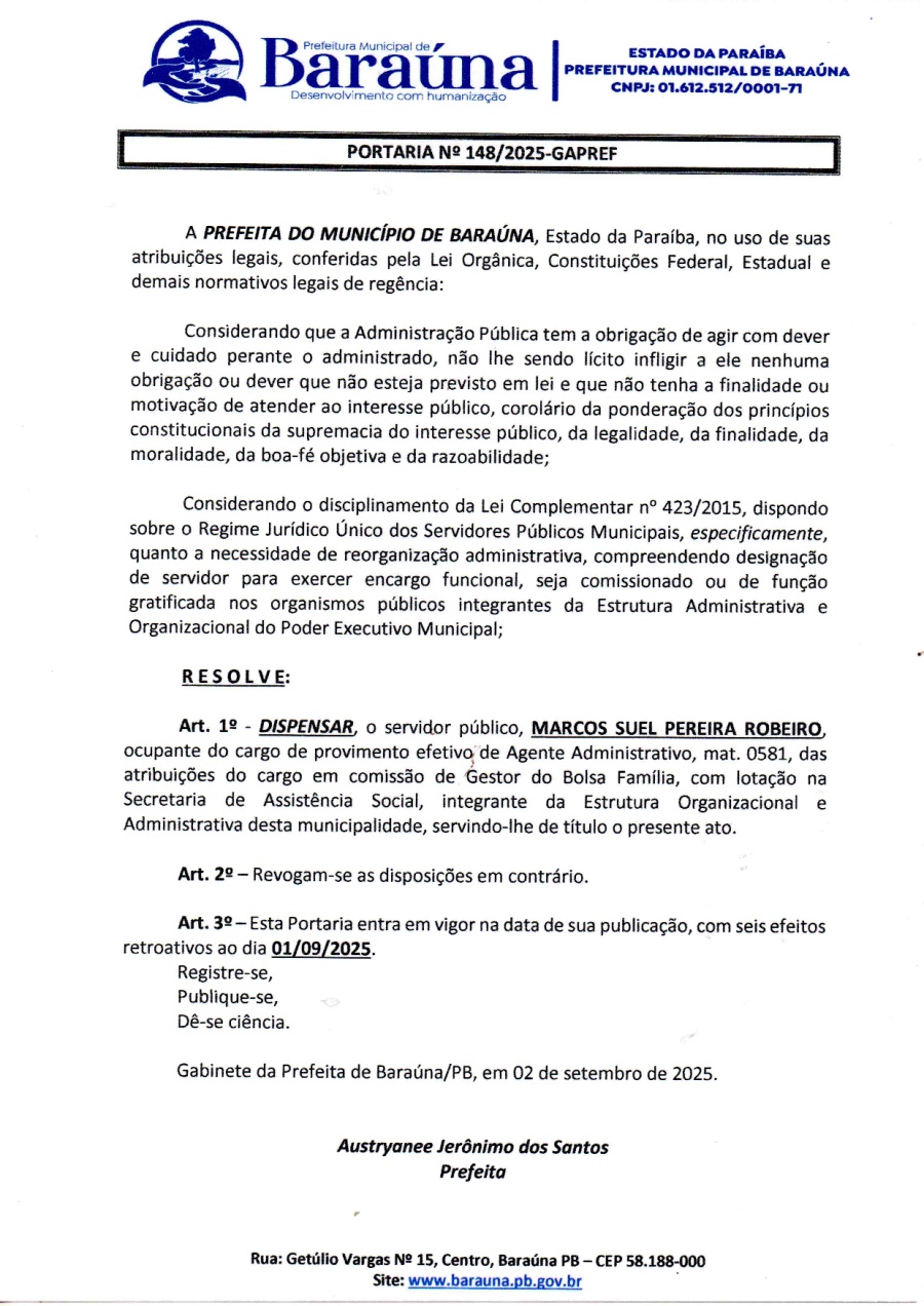 PORTARIA Nº 148/2025-GAPREF - DISPENDAR O SERVIDOR PÚBLICO MARCOS SUEL PEREIRA RIBEIRO, DO CARGO DE PROVIMENTO EFETIVO DE AGENTE ADMINISTRATIVO. - 03 DE SETEMBRO DE 2025.
