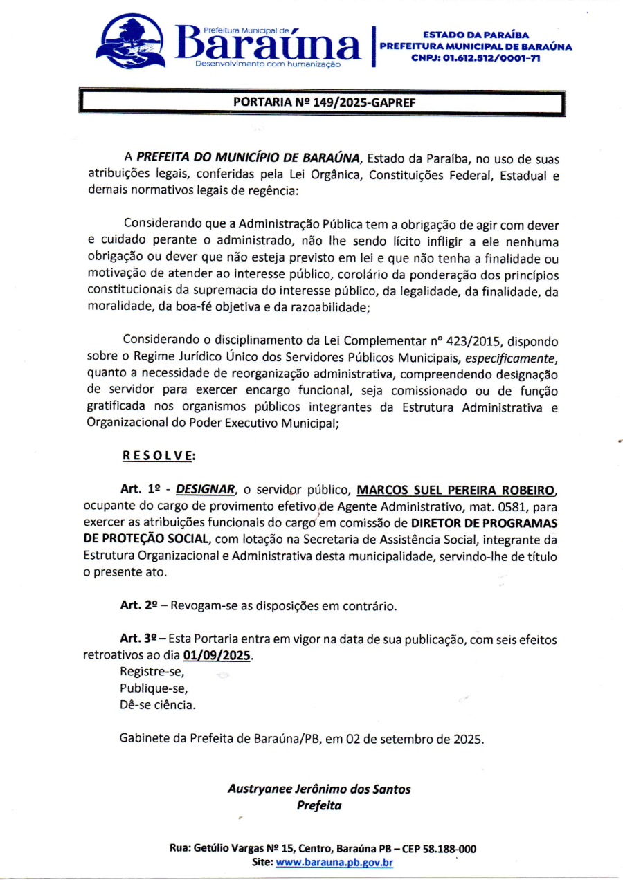 PORTARIA Nº 149/2025-GAPREF - DESIGNAR O SERVIDOR PÚBLICO MARCOS SUEL PEREIRA RIBEIRO , PARA EXERCER AS ATRIBUIÇÕES FUNCIONAIS DO CARGO EM COMISSÃO DE DIRETOR DE PROGRAMAS DE PROTEÇÃO SOCIAL. - 03 DE SETEMBRO DE 2025.