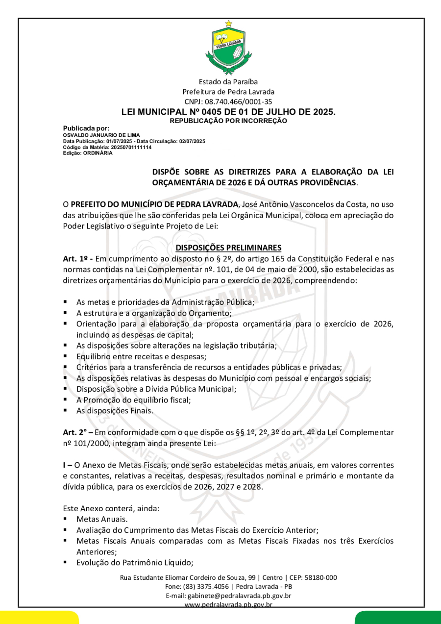 LEI Nº 0405/2025 - DISPÕE SOBRE AS DIRETRIZES PARA A ELABORAÇÃO DA LEI ORÇAMENTÁRIA DE 2026
