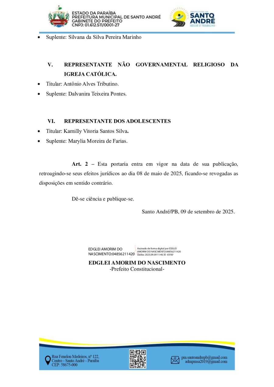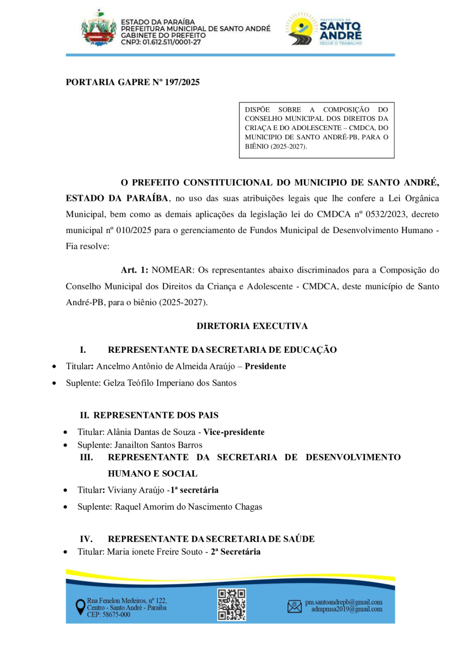 PORTARIA GAPRE Nº 197/2025 - DISPÕE SOBRE A COMPOSIÇÃO DO CONSELHO MUNICIPAL DOS DIREITOS DA CRIAÇA E DO ADOLESCENTE – CMDCA, DO MUNICIPIO DE SANTO ANDRÉ-PB, PARA O BIÊNIO (2025-2027).