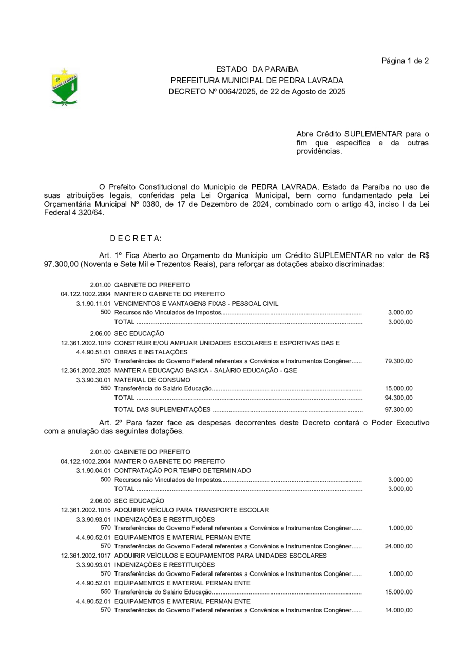 DECRETO N° 0064/2025 - ABRE CRÉDITO SUPLEMENTAR PARA O FIM QUE ESPECIFICA