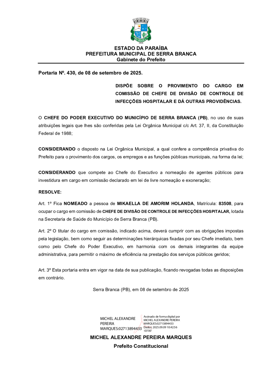 PORTARIA N° 0430/2025 - NOMEAÇÃO DE MIKAELLA DE AMORIM HOLANDA
