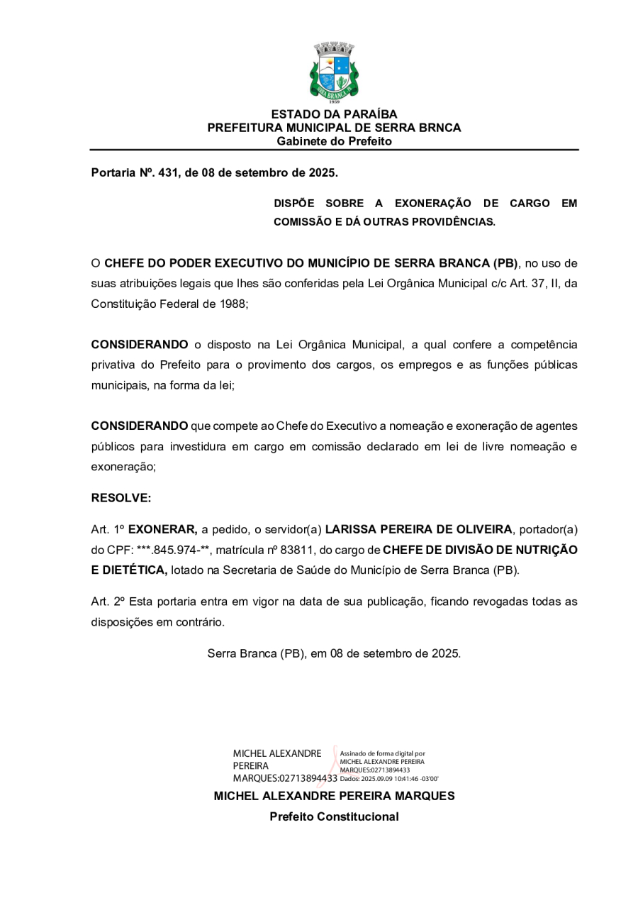 PORTARIA N° 0431/2025 - EXONERAÇÃO À PEDIDO DE LARISSA PEREIRA DE OLIVEIRA