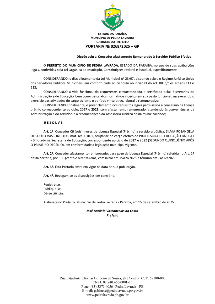 PORTARIA N° 0268/2025 - DISPÕE SOBRE CONCEDER AFASTAMENTO REMUNERADO À SERVIDOR PÚBLICO EFETIVO