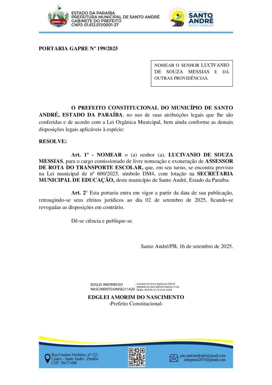 PORTARIA GAPRE Nº 199/2025 - NOMEAR O SENHOR LUCIVANIO DE SOUZA MESSIAS E DÁ OUTRAS PROVIDÊNCIAS.