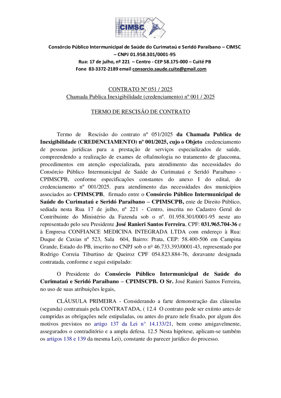 CONTRATO N° 0051/2025 - CHAMADA PUBLICA INEXIGIBILIDADE (CREDENCIAMENTO) N° 0001/2025 - TERMO DE RESCISÃO DE CONTRATO