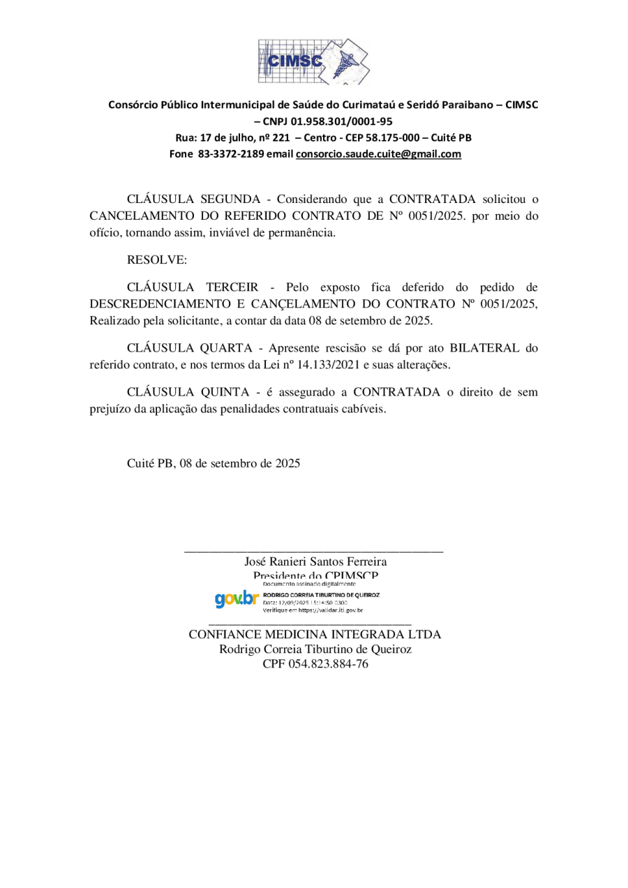 Conforme MP n° 2.200-2 de 24/08/2001, que institui a infraestrutura de chaves Públicas. Matéria Publicada no Diário Oficial do Consórcio Intermunicipal de Saúde do Curimataú e Seridó Paraibano/PB no dia - Edição 01309.